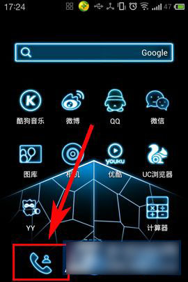 1)打开自己的手机界面点击左下角手机自带(电话)标志,进入打电话界面点击功能键点击【设置】。(如下图所示)