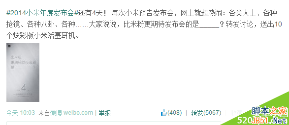 小米手机微博2014小米年度发布会活动参与微博地址:http://weibo.com/2202387347/Be6JUlMWS