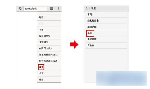 1)在浏览器界面,打开选项菜单,依次点击【设置】【 高级】(如下图)