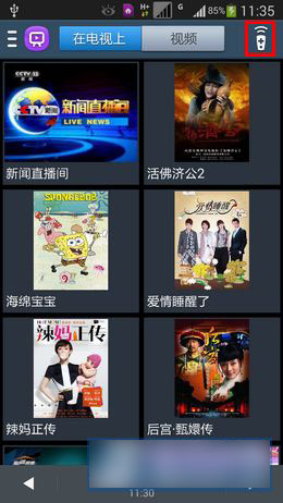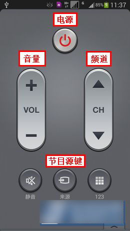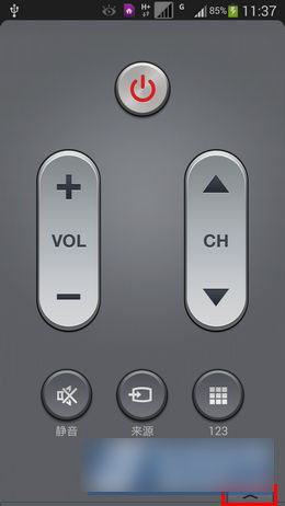 9)上述操作完毕后,即可使用手机上的按钮遥控电视,点击【上拉菜单栏】,可展开更多选项按钮(如下图)