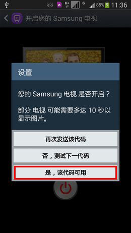 8)确认电视机是否开启,若已开启,请选择【是,该代码可用】。根据情况,选择信号来源接收频道。(如下图)