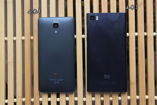尽管小米4和小米3均采用5英寸屏幕机身,不过通过以下小米4和小米3外观对比可以发现,小米4的机身尺寸要比小米3明显更小,这主要是由于小米4采用了超窄屏幕边框的功劳。另外小米4的并角采用了圆角设计,与小米2类似,与此前小米3的硬朗边角有所不同,如下图所示: