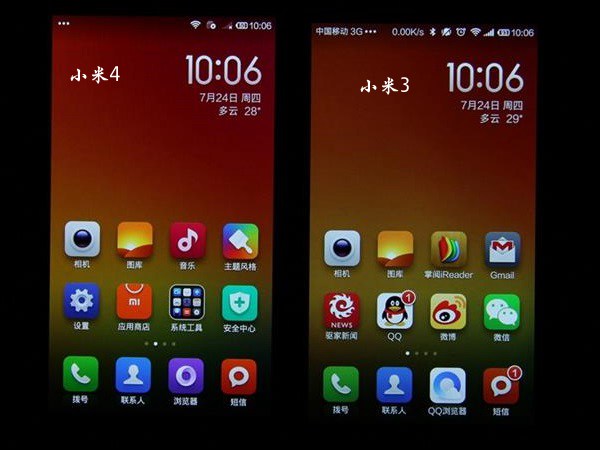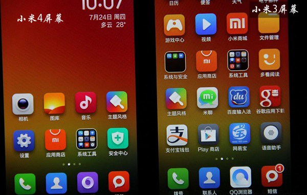 如果大家觉得上面这张对比图效果不是很明显的话,我们通过放大对比一番即可看出来,如下图,通过两者桌面应用图标,明显可以感受到小米4屏幕应用图标更为清新一些。