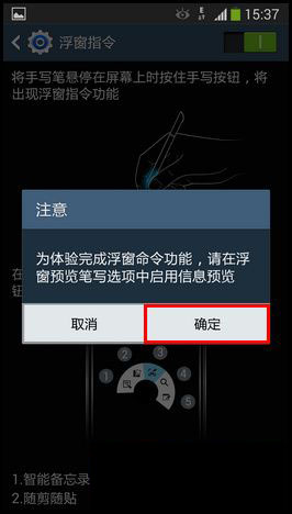 3)屏幕上显示“为体验完成浮窗命令功能,请在浮窗预览笔写选项中启用信息预览”,点击【确定】即可(注:请确保开启【浮窗预览】-【浮窗视图画笔选项】-【信息预览】) 。【浮窗指令】右侧显示绿色代表开启。(如下图)