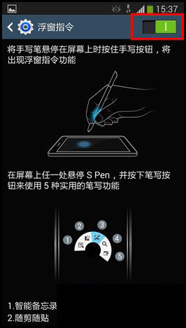 Galaxy Note3如何开启S Pen浮窗指令。三星Galaxy Note3的S Pen浮窗指令宛如神奇的魔法,助您瞬间完成各项指令。您只需将S Pen悬浮于手机屏幕上方的任何位置,轻点笔杆的按钮,屏幕上就会自动弹出S Pen浮窗指令的5个常用的强大功能:智能备忘录、随剪随贴、截屏编写、S搜索和随笔窗口。S Pen浮窗指令可随时开启,省去了反复切换屏幕的麻烦,让您的任务处理更加轻松便捷。具体操作方法如下: