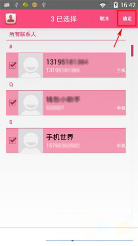 3)在选择联系人完成后,就点击“确定”按键,最后在编辑好内容后,在按“发送”按键。