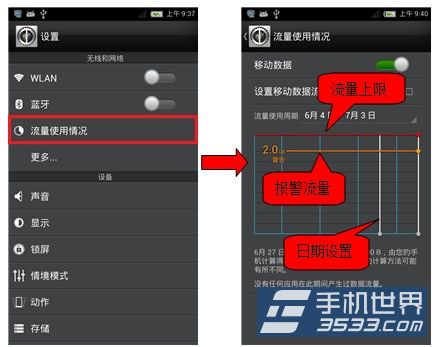 4)流量监控:在待机屏幕选择【设置】→【流量使用情况】,可使用手机内置的流量控制功能。 您可以方便地查看网络流量、设置移动数据限制、设置警告等,从而有效管理移动数据的使用情况。您也可以再手机上安装使用第三方的流量监控软件,以实时监测流量的使用情况,避免不必要的超流量上网情况发生。(如下图)