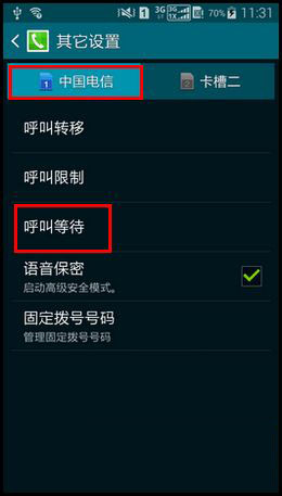 3)滑动屏幕,选择【其它设置】选择您需要设置呼叫等待的SIM卡(这里以“中国电信”卡为例),然后点击【呼叫等待】。