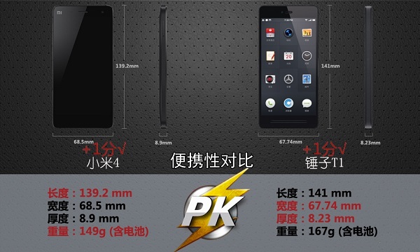 小米4的机身尺寸为139.2x68.5x8.9mm,机身重量为149g。而锤子T1手机机身尺寸为141x67.7x8.23mm,如下图所示: