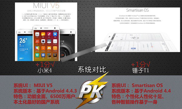 | 系统版本 | MIUI V5(Android OS 4.4) | Smartisan OS(Android OS 4.4) |