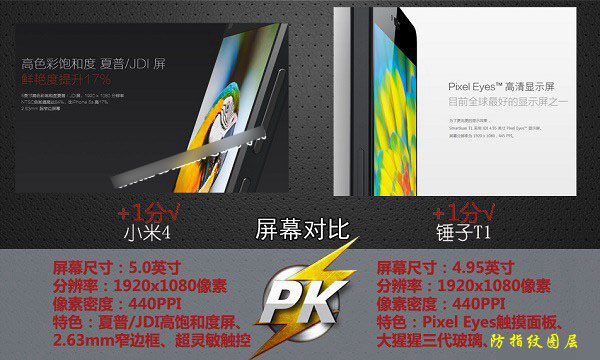 小米4采用的是5英寸1920X1080像素全高清屏幕,屏幕像素密度为440PPI,采用的是夏普/JDI高饱和度屏幕,具备2.63mm超窄边框,超灵敏触控等亮点。而锤子T1手机采用4.95英寸1920X1080像素全高清屏幕,屏幕像素密度也达到了440PPI,其具备Pixel Eyes触控面板、大猩猩三代玻璃以及防指纹涂层特性。