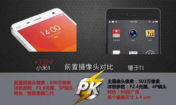 小米4采用了前置800万像素F/1.8大光圈5P镜头,具备智能美颜功能。而锤子手机T1拥有前置503万像素F/2.4光圈,4P镜头摄像头,具备88度广角,单个像素达到1.4um特性。