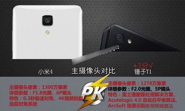 小米4后置1300万像素F/1.8大光圈6P镜头摄像头,具备0.3秒极速对焦,4L视频拍摄以及追踪对焦系统等功能。而锤子T1手机拥有后置1278万像素F2.0光圈5P镜头,具有富士通图形处理器解决方案,Acutelogic 4.0自动白平衡算法,ArcSoft场景识别和夜景降噪等亮点。