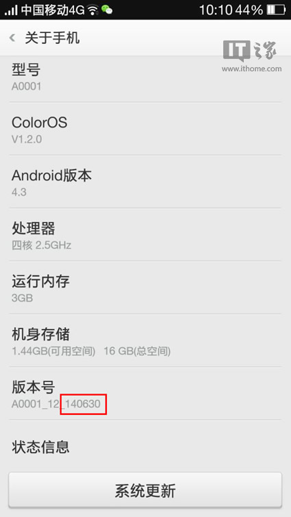 1、一加手机默认出厂系统为Color OS 1.2(测试版的Color OS 2.0暂不支持),一般情况下拿到手机后都不是最新的版本,需要通过OTA升级到最新的140630版本。(如果已经升级至最新的140630版本,请忽略次步骤)
