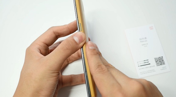 5、接下来我们再从左边的电源键一侧打开,只需要轻轻用力即可打开一加手机后盖,如下图所示: