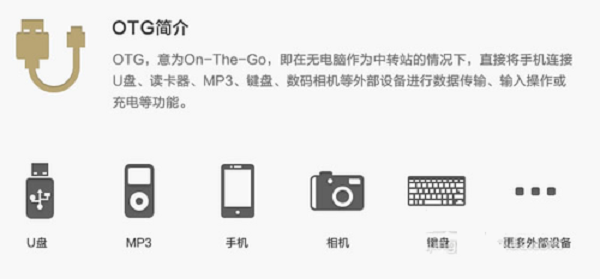在回答之前我们还是了解一下什么是手机OTG,简单的说,OTG就是可以连接外置设备的功能,比如U盘,数码相机,数码摄像机,手机,移动硬盘等,现在会发展这一功能的主要是MP4,由于MP4容量有限,加了这一功能就等于无限量加大了储存容量,拥有OTG功能的MP4只要插上OTG连接线就可以另外接移动硬盘,U盘观看其视频文件,但OTG只能进行简单的复制,删除和一些简单的操作,不过已经不错了,很实用的功能.