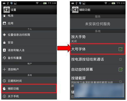 1)找到关进入【设置】界面点击【辅助功能】,在【大号字体】后面的方框中打勾来调整屏幕显示字体大小。(如下图)