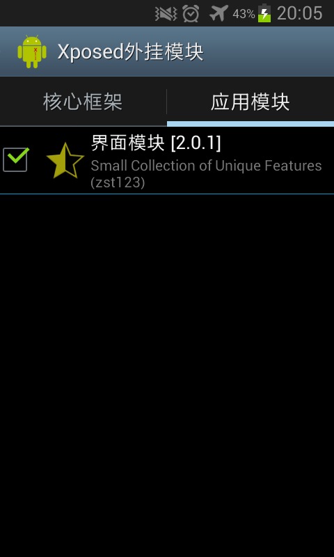 给界面模块打钩,重启系统。再次进入Xposed,从右边进入应用模块,点界面模块,进入