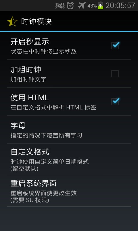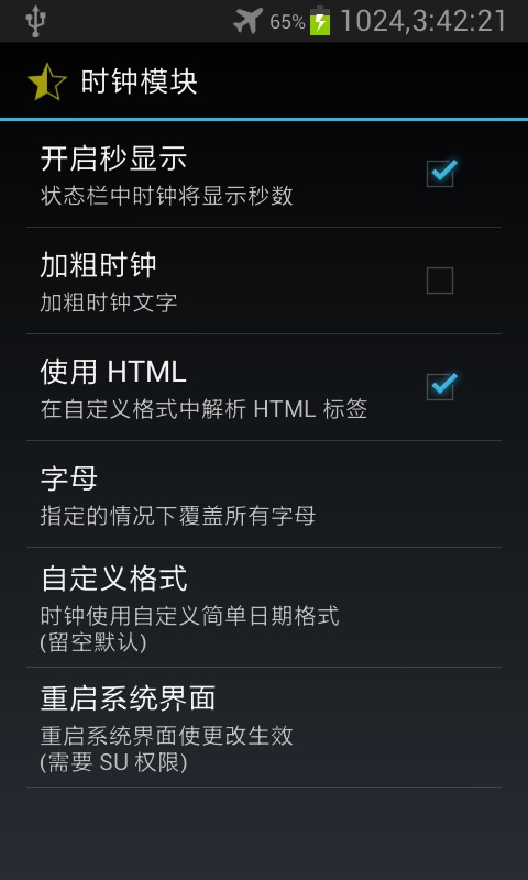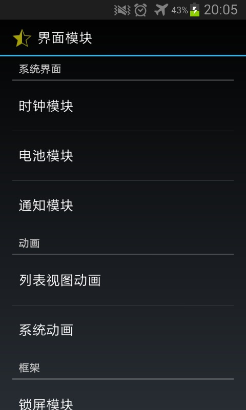 不知怎么回事,变成了12小时制了,不知道是不是格式不对呢,还请有知道的大神指出。另外界面模块里面的其他功能我就不一一说明了,大家可以自己试试吧,应该都可以用,没什么问题。建议可以把系统动画里面的动画控件都打开,然后动画时长稍微调短点(以免感觉手机反应变慢了),以后玩手机的时候动画就不像以前那样单调啦!