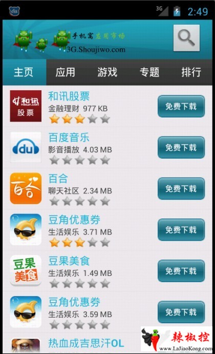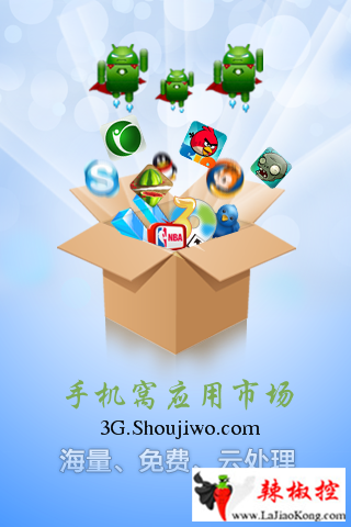 你只需将手机连接wifi,然后下载一个安卓市场客户端,然后从安卓市场客户端上面搜索需要的应用即可。安卓市场呢,市面上有很多,本身小辣椒也有个小辣椒市场,论坛也有一个手机窝安卓市场,我就以手机窝安卓市场 来“举个栗子”告诉大家。
