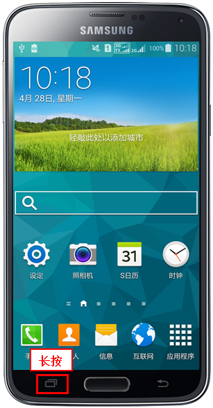1.在待机页面下,长按屏幕左下角的【最近应用程序】键。