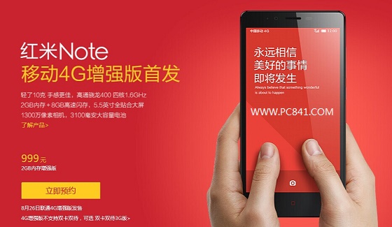 4G版红米Note预约购买网址:点此进入小米网预约红米Note 4G。