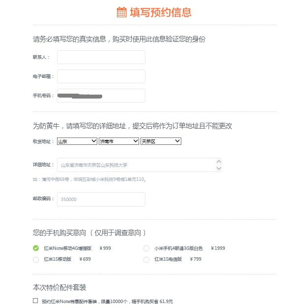 2、点击预约后,如果此前没有登录,登录后,需呀填写预约信息,主要是填写自己的姓名、电话号码、收货地址等,如下图所示。