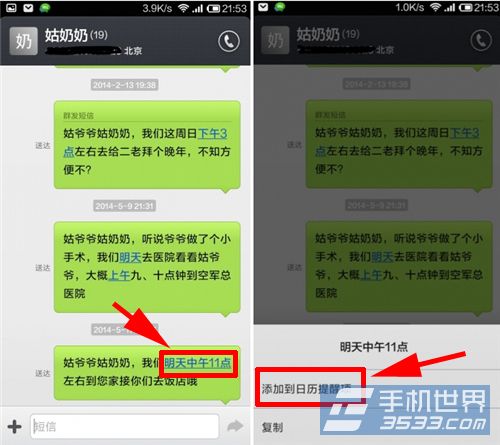 1)打开小米4包含时间的短信,根据所需,点击短信上出现的时候如【明天中午11点】,接着选择【添加到日历提醒项】。(如下图)