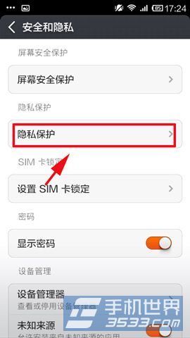 1)找到并打开手机【设置】,在【全部设置】面板中选择【安全和隐私】,接着点击【隐私保护】。(如下图)
