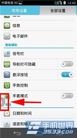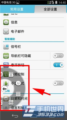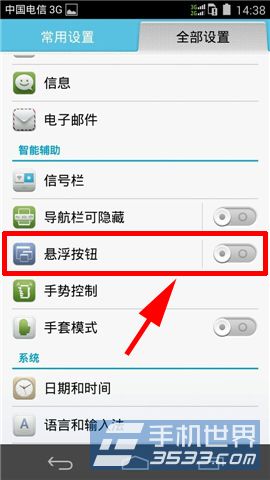 1)找到并打开华为荣耀6的手机【设置】在人“全部设置”面板中,点击【悬浮按钮】即可(如下图)