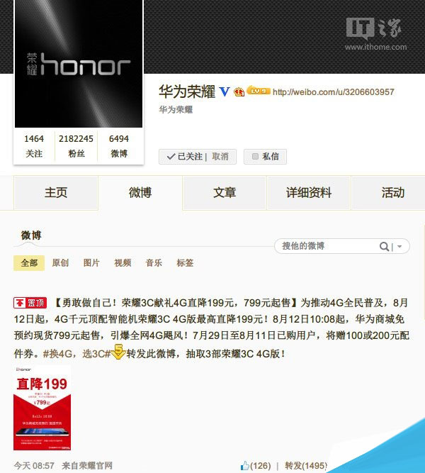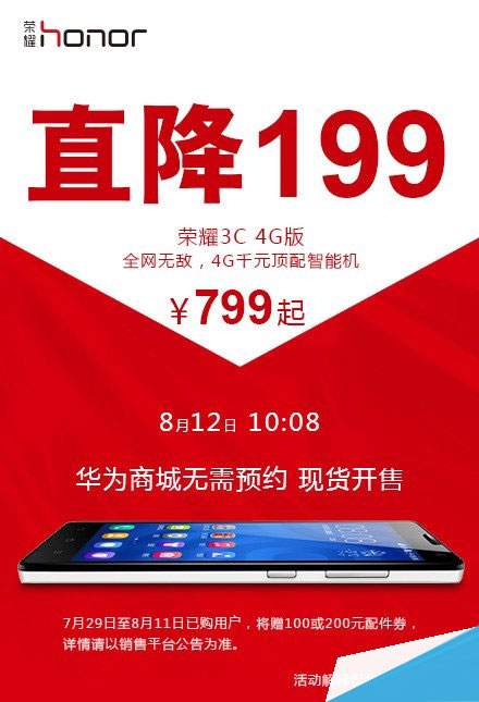 华为荣耀在5月下旬发布了新机荣耀3C 4G版,新机价格998元起。日前华为荣耀官方宣布荣耀3C开展献礼4G活动,4G版新机直降199元,8月12日现货发售。