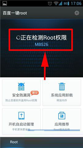 1)下载安装并打开百度一键ROOT,进入应用后,它会自动识别机型并开始ROOT。(如下图)
