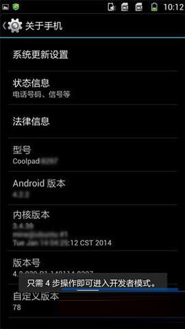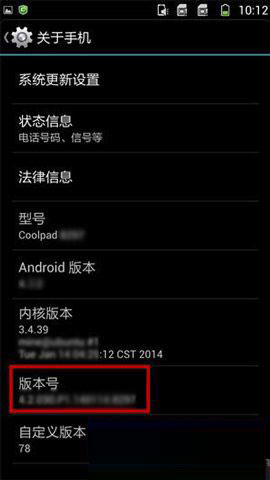 1)打开酷派s6的手机【设置】进入【关于手机】界面,找到【版本号】连续点击4次。(如下图)
