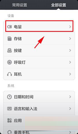 1)找到并打开小米4手机【设置】,在全部设置面板中点击【电量】。(如下图)