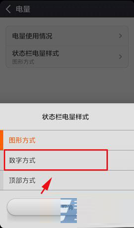 2)选择【状态栏电量样式】在列表中点击【数字方式】即可。(如下图)