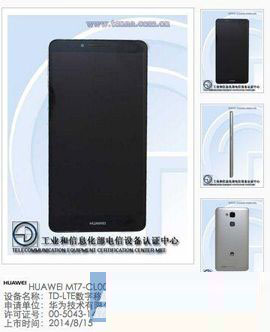 华为发布重磅新品Ascend Mate7发布时间是9月4日,距离发布会还有半个月,而近日,记者从工业和信息化部电信设备认证中心网站了解到,Mate7的移动版和电信版均已获得入网许可证(联通版去哪了?),对应型号分别为MT7-TL00和MT7-CL00,且工信部的“定妆照”也已经更新,照片上清晰可看到Mate7背面是有指纹识别器的。