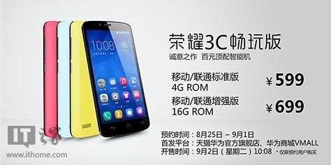 该机售价,标准版(4G ROM)599元,增强版(16G ROM)699元,8月25日起开启预约,9月2日正式开售。