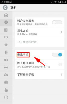 1)开启服务,找到并打开魅族手机【设置】点击【帐户】,使用Flyme帐号登录。将【查找手机】选项激活。(如下图)