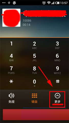 1)打开小米3选取联系人并拨号,点击【更多】后打开【录音】。(如下图)