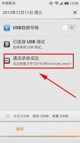 2)待通话结束后,轻触主屏并下滑,打开通知栏便看到录音保存的文件。(如下图)