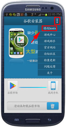 2)打开谷歌安装器,点击右上角【三点】,点击【修改hosts】(需要有root权限);点击【添加帐户】。(如下图)