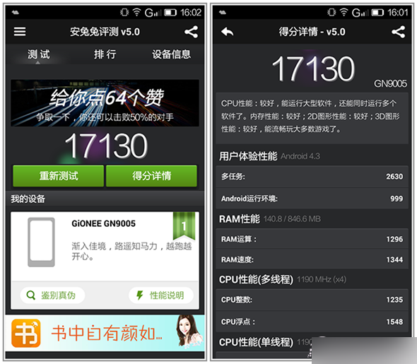 从结果上看,ELIFE S5.1跑分成绩为17130分,在大多数手机排名并不靠前。小编在开启多个应用的情况下会出现卡顿现象。
