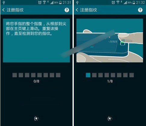 三、设置完备用密码之后,接下来就需要设置指纹信息了,三星Note 4支持用户录入3个指纹信息,也就说,用户可以录入三个手指的信息。每个指纹注册的时候需要同一手指重复录入8次,这样能保证较高的指纹识别率,如下图所示: