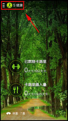 2)点击【S健康】;进入S健康界面后点击左上角的【三横】。