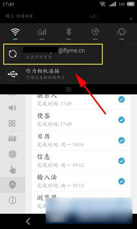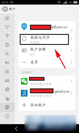 1)找到并打开魅族mx4手机【设置】,点击并登陆【帐户】,点击【数据与同步】;点击【同步】通知栏上面就有显示一个云服务的标志,说明它正在努力上传。(如下图)