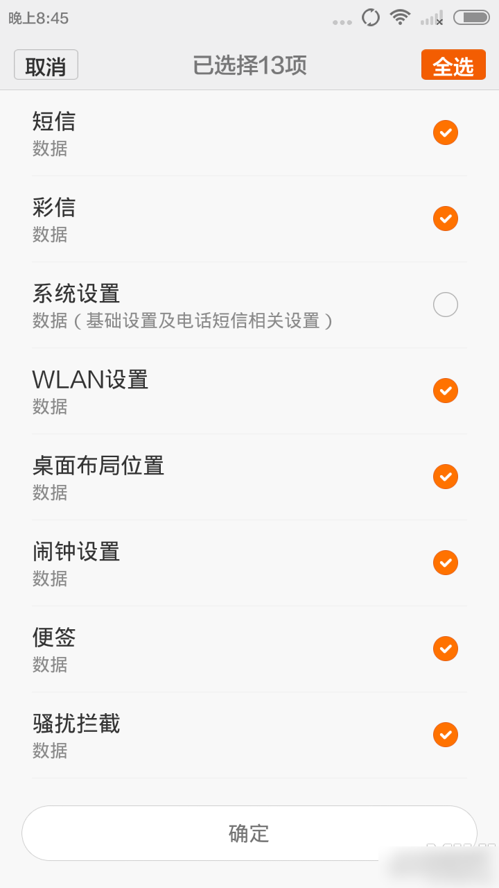 >由于数据不兼容,请不要对“系统数据-->系统设置”进行恢复(其他数据可正常恢复,如图示)。