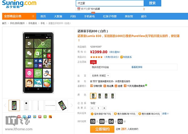 报道,国行版Lumia830已经在苏宁易购开放预约,有白、橙、黑、绿四种颜色可选;据苏宁易购的预约时间限制,国行版Lumia830将在15天后正式开卖,售价2399元。