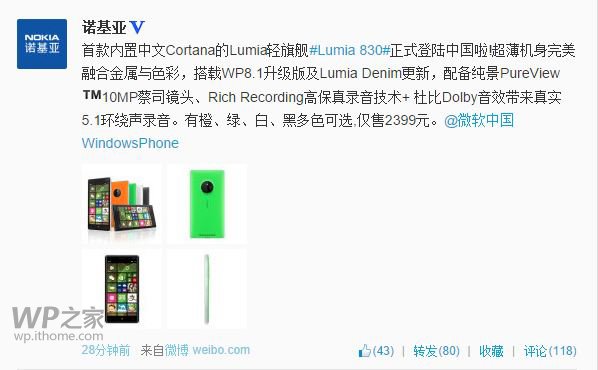 WP8.1 GDR1新机Lumia830九月初发布,月底终于将在中国大陆上市。此前苏宁预约页抢先曝光Lumia830价格,而现在诺基亚在微博上,确认国行版Lumia830售价为2399元,搭载WP8.1 Update及Lumia Denim更新。