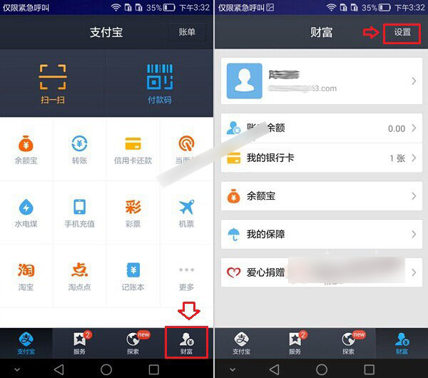 1.在新版的支付宝钱包中,都加入了指纹支付功能。你可以在华为Mate7中安装新版支付宝钱包,然后打开支付宝钱包,之后再进入【财富】-【设置】,如下图所示。
