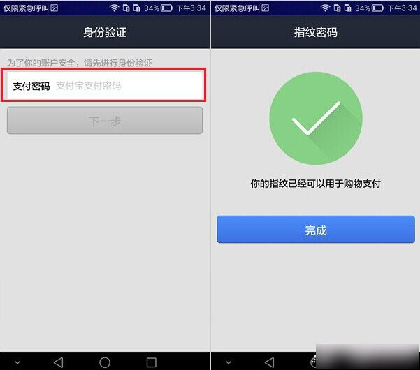 4.为了防止指纹信息被盗用,你还需要输入一次支付宝支付密码确认,当指纹和支付密码验证成功之后【脚本之家WwW.PC841.Com原创教程】,华为Mate7的支付宝指纹支付功能就开启成功了,如下图所示。